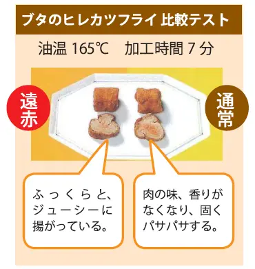 Temperature rises by more than 7°C per minute, with a start-up time of 25 to 30 minutes. Heat is supplied quickly because the amount of heat energy effectively utilized is about twice as high as conventional products. Temperature drop when turned on is small, and recovery time is fast, so food always comes out crispy.
