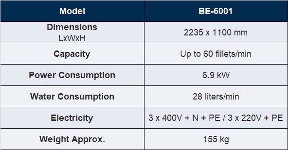 The Beritech BE-6001 Fillet Washer not only excels in removing slime and scales but also significantly reduces product contamination, ensuring that salmon fillets are both clean and dry prior to packing or further processing.