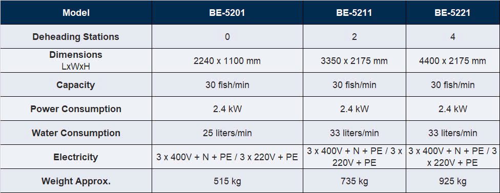 The Beritech BE-5200 model supports the integration of optional manual deheading stations, tailored for either two or four operators (models BE-5211 and BE-5221, respectively). These stations are equipped with belly rinse pipes designed to thoroughly clean the abdominal cavity of the salmon, enhancing the overall quality and safety of the product.