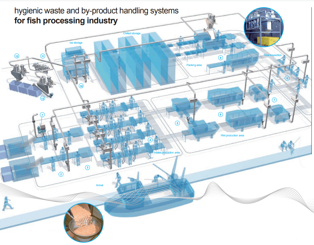 Hygienic, fast and erconomic vacuum conveying solution for waste and by-products in the fish processing lines.