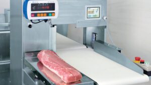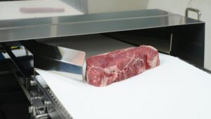 The shape is read by the displacement sensor without contact, which is hygienic and will not deform the product. The product value is not compromised because the product is not stressed. After the material is weighed, simply place it on the meat-feeding belt conveyor and press the start switch.