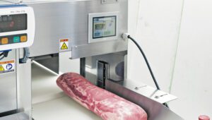The shape of the meat rod is read by the 3D measuring instrument before slicing, eliminating the need for weight feedback and enabling fast fixed weight processing.