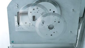 The shape of the material is read by two displacement sensors in the upper and lower sections, and slicing starts automatically.