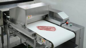 The shape is read by the displacement sensor without contact, which is hygienic and will not deform the product. The product value is not compromised because the product is not stressed. After the material is weighed, simply place it on the meat-feeding belt conveyor and press the start switch.