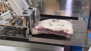 ●The length of raw meat is automatically measured, and the most efficient initial cutting position based on the thickness setting is automatically calculated to minimize the amount of residual meat and improve yield.
