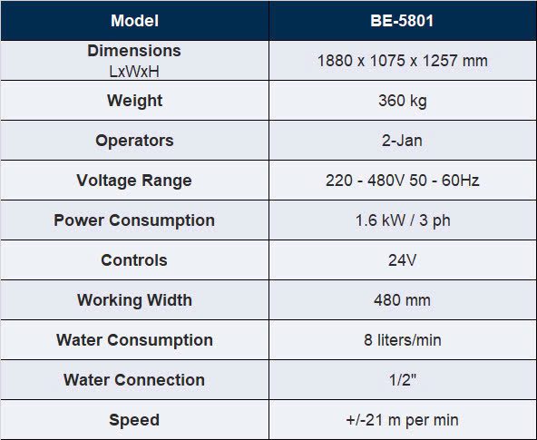 Made with operational efficiency in mind, the BE-5801 features configurable infeed and outfeed options in multiple lengths, allowing for optimization according to the unique demands of each facility.